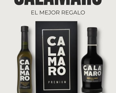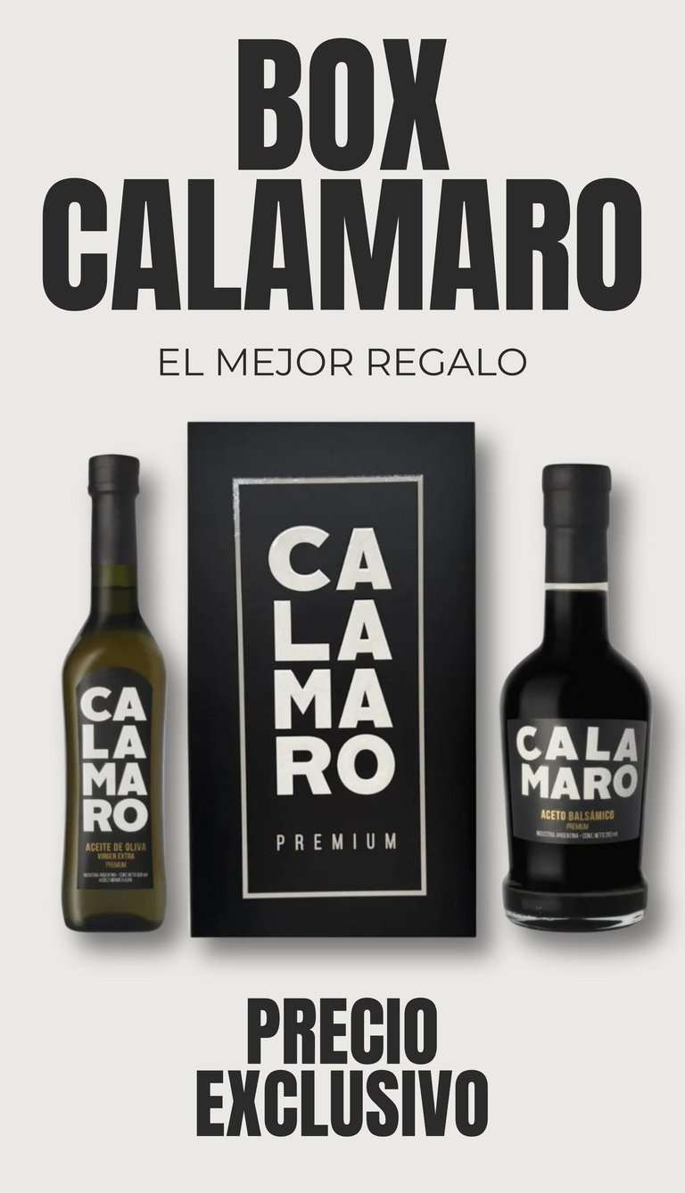 La caja contiene: -1 Botella de 500ml de Aceite de oliva virgen extra Calamaro premium -1 Botella de 250ml de Aceto Balsámico Calamaro premium.